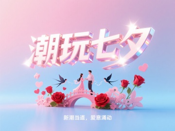以粉蓝渐变营造浪漫氛围,“潮玩七夕” 立体字亮眼,搭配鹊桥、恋人、玫瑰与飞燕,传递出七夕新潮且爱意满满的独特感觉。