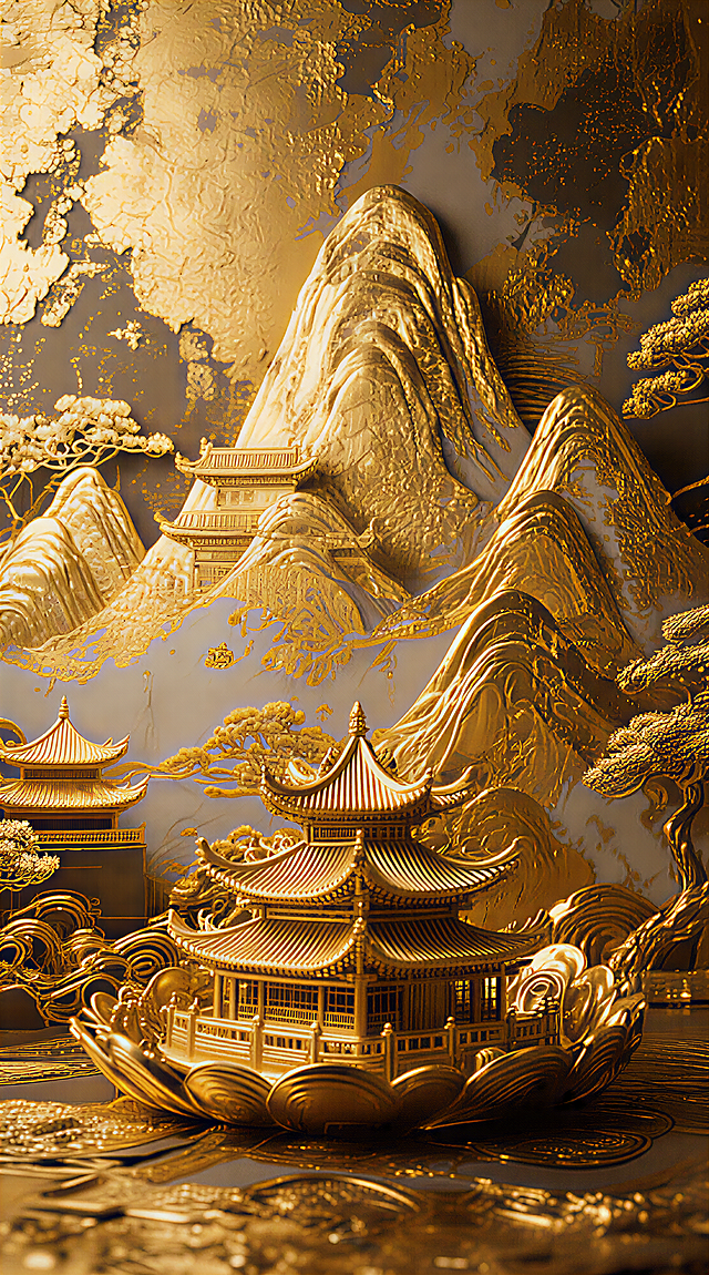 国潮风插画,鎏金浮雕质感,红金主调彰显中式奢华与喜庆,古典宫殿与山水相映,梦幻刺绣纹理点缀,尽显节日祥瑞之气。详情
