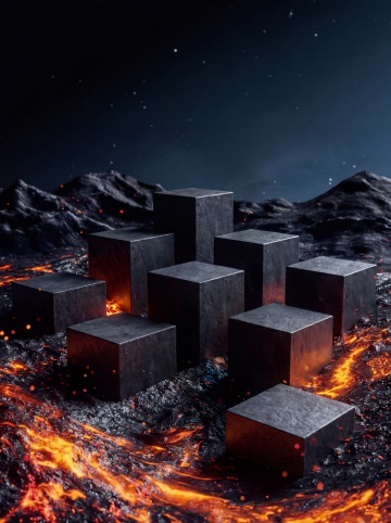 极简主义摄影风格,深色背景展台设计,展台主体为一块悬浮于平静水面的不规则深色岩石展台,岩石表面呈现自然的粗糙质感与细微纹理,展台在水面形成清晰对称的倒影,水面泛着柔和的蓝色光泽并带有轻微涟漪,背景是渐变的深灰色天空与朦胧的远山轮廓,整体色调以深灰、蓝灰为主,营造出宁静、沉稳、高级的氛围,光线柔和均匀,突出展台的立体感与材质感,画面构图简洁,留白充足,视觉焦点集中于中央的岩石展台,体现出自然、简约而富有力量感的设计美学。
