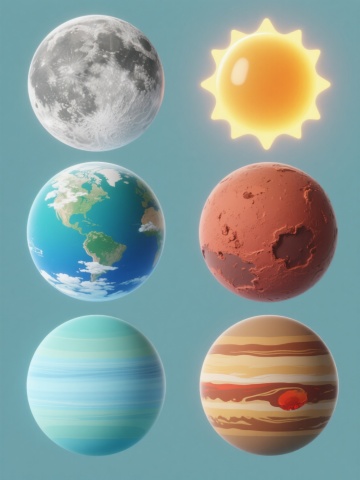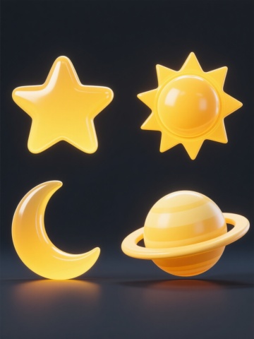 纯色背景,立体风格,四个完全不同的天体元素系列素材集合规整排布,第一个是橙色圆形太阳带有黄色放射状光芒和白色高光,第二个是黄色月牙形状月亮带有黄色渐变和白色轮廓线,第三个是蓝色圆形星球带有白色环形纹路和高光,第四个是黄色五角星带有黄色渐变和白色轮廓线,所有元素均采用圆润立体造型,边缘有白色高光和黄色阴影,保持简洁明快的设计风格