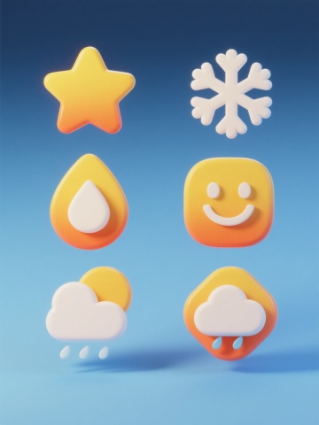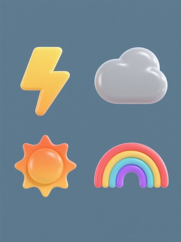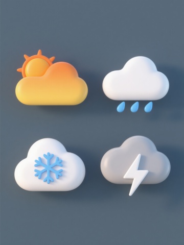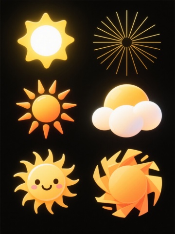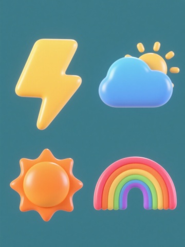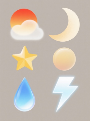 简约现代风格气象元素系列素材,纯色背景,无文字无logo无水印。每张素材中央规整排布单一气象元素图案,元素造型简洁圆润,边缘柔和,带有细腻的渐变色彩过渡和轻微的放射状纹理笔触。太阳:橙红色圆形,中心深橙向边缘渐变至暖黄色,底部有流动感的浅色纹理;云朵:蓬松的白色云团造型,边缘柔和模糊,内部有细微的层次感纹理;月亮:弯月形,采用柔和的米黄色至淡黄色渐变,表面有细腻的阴影纹理;星星:五角星造型,明亮的黄色,边缘锐利但带有轻微的光晕效果,中心可略带高光;雨滴:下尖上圆的泪滴形状,透明感的蓝色渐变,底部尖锐处可带轻微反光;闪电:折线形闪电图案,亮白色至淡蓝色渐变,线条流畅且带有电光的锐利感。所有元素保持一致的简约设计语言、柔和渐变色彩风格和细腻纹理表现,确保系列素材的整体统一性。