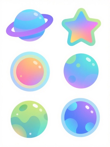 一组6个相同造型的卡通风格行星图标集合,每个行星都有带白色条纹的环形轨道、表面点缀着白色星星和橙色小星星,周围环绕着彩色小星球和流星线条,整体呈圆形构图,行星位于中心位置,所有图标在纯色背景上规整排列成2行3列的网格布局。第一个行星采用光滑玻璃材质,呈现深邃的蓝色渐变,环形轨道为半透明紫蓝色,背景为纯白色;第二个行星为哑光金属质感,整体呈银灰色,环形轨道为磨砂金属灰并带有白色高光条纹,背景为浅灰色;第三个行星是木质纹理材质,行星表面为温暖的棕黄色木纹,环形轨道为深棕色并保留白色条纹,背景为米白色;第四个行星为霓虹灯发光材质,行星主体为亮粉色渐变并带有发光边缘,环形轨道为亮蓝色发光效果,白色条纹部分发光更强,背景为深紫色;第五个行星是毛绒材质,整体呈柔和的浅绿色,表面有绒毛质感,环形轨道为浅粉色毛绒材质,白色条纹为白色绒毛,背景为淡蓝色;第六个行星为水晶材质,呈现清澈的紫色透明感,内部有细微的水晶纹路,环形轨道为透明蓝色水晶并带有白色条纹,背景为淡黄色。所有图标保持完全一致的元素内容和造型结构,仅在材质表现和整体色彩上形成鲜明对比,每个图标独立在各自的纯色背景中,整体设计风格统一为可爱卡通,视觉效果和谐且富有系列感。