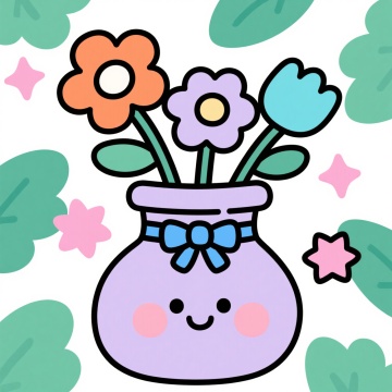 一个可爱的卡通花瓶,瓶身是柔和的紫色,脸上带着微笑的表情,脸颊有粉色腮红,脖子系着天蓝色的大蝴蝶结,花瓶中插着三朵花,分别是橙色、淡紫色和青色,周围有绿色的叶子和粉色的星星装饰,整体采用简洁的平面插画风格,线条圆润流畅,色彩明亮柔和,白色背景,充满童趣和欢快氛围
