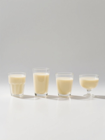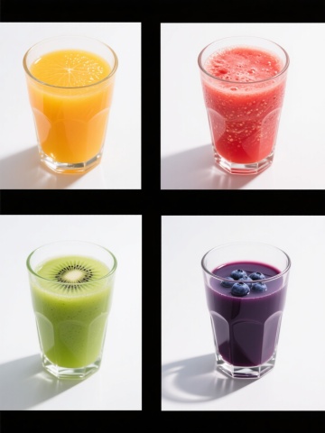 一组四个不同果汁饮品的写实风格产品展示图,保持与原图一致的高清晰度商业摄影质感,纯净白色背景,柔和的顶部光源产生自然的高光和轻微阴影。第一个为装满橙色橙汁的透明玻璃杯,杯口有细密泡沫;第二个是装满亮黄色柠檬汁的矮胖玻璃杯,杯壁有柠檬片装饰;第三个是装着粉红色西柚汁的高脚玻璃杯,杯口插有薄荷叶;第四个是透明塑料瓶装的绿色猕猴桃汁,瓶身有水滴效果。所有饮品色彩鲜艳饱和,液体质感通透,容器边缘清晰锐利,整体构图对称平衡,元素大小统一,呈2x2网格规整排布,突出健康饮品的清新感和高品质。