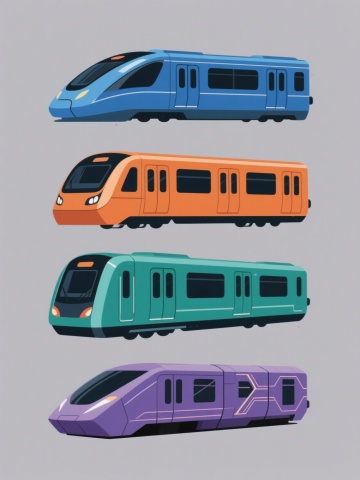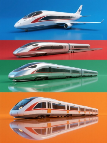 一系列6个现代交通工具主题的插画集合,每个元素采用不同纯色背景(如蓝色、绿色、紫色、红色、黄色、灰色),保持原插画的3D立体风格、圆润流畅的线条、光滑的金属质感和明亮柔和的光影效果,画面整体色彩变换为对应纯色背景的和谐色调,元素类目为交通工具,包括高速列车、飞机、轮船、汽车、地铁、自行车,每个交通工具都有独特的颜色搭配和细节设计,所有元素规整排布,形成统一且富有变化的系列素材。