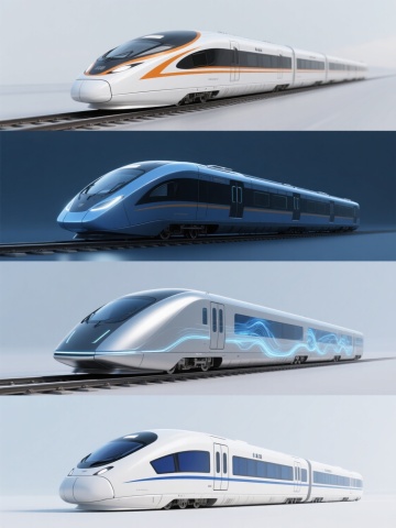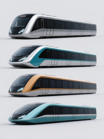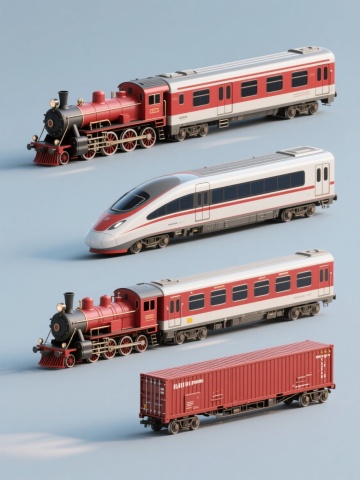 一套4个完全不同造型的现代火车元素系列素材集合,均采用与原图一致的3D渲染风格,具有光滑的金属质感、明亮的高光和清晰的阴影细节,主色调为红色与白色搭配,车窗为深绿色。每个火车造型独特:1. 流线型子弹头高速列车;2. 复古蒸汽机车头配红色车厢;3. 双层观光列车,带有大面积观景窗;4. 货运列车,车头强壮有力并带有部分集装箱。所有火车元素均独立置于纯白色纯色背景上,以规整的网格状排布,保持统一的光照方向和投影效果,整体设计简洁明快,具有高度的视觉一致性和系列感。