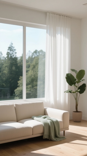 极简主义风格的居家背景,明亮通透的室内空间,三扇宽大的落地窗,覆盖着轻盈飘逸的白色纱帘,阳光透过纱帘在浅色木地板上投下柔和的窗格光影,地面铺着一块米白色的柔软长毛地毯,整体色调以纯净的白色和温暖的浅木色为主,光线明亮柔和,营造出宁静、简约、舒适的氛围,具有高度的空间感和自然采光效果。