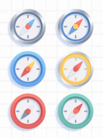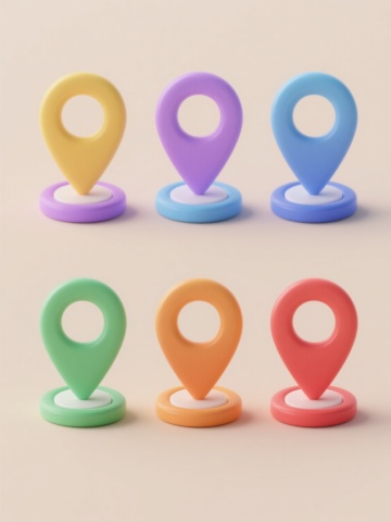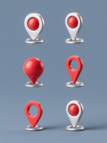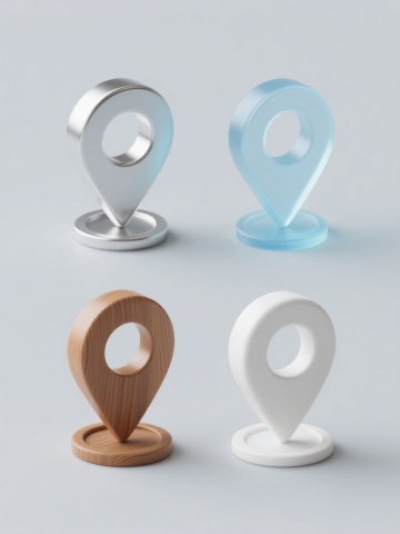 一组四个相同造型的地图定位标记图标系列,每个图标具有完全不同的材质表现,规整地排列在纯色背景上。图标主体为上半部分的红色水滴状标记和下半部分的蓝色圆形底座的组合形态。第一个图标呈现光滑的塑料材质,表面有细腻的高光,色彩为明亮的柠檬黄标记配天蓝色底座;第二个图标为磨砂金属质感,带有细微的纹理和柔和的反光,色彩为深灰色标记配银色底座;第三个图标是半透明的玻璃材质,边缘有光晕效果,色彩为淡紫色标记配浅青色底座;第四个图标为哑光陶瓷质感,表面温润无明显反光,色彩为橙红色标记配橄榄绿底座。所有图标保持一致的简约扁平风格,造型结构完全相同,仅在材质和整体色彩上做变换,整体布局整齐有序,背景为纯白色。