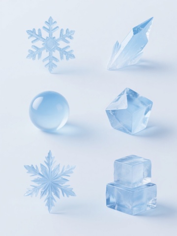 透明冰雕造型的雪花,每个冰晶棱角分明,内部有细微的冰裂纹理,整体呈现出晶莹剔透的质感,以浅蓝色为背景,光线从上方柔和照射,在冰晶表面形成明亮的高光和淡淡的阴影,雪花彼此紧密排列,充满整个画面,营造出寒冷而纯净的氛围。