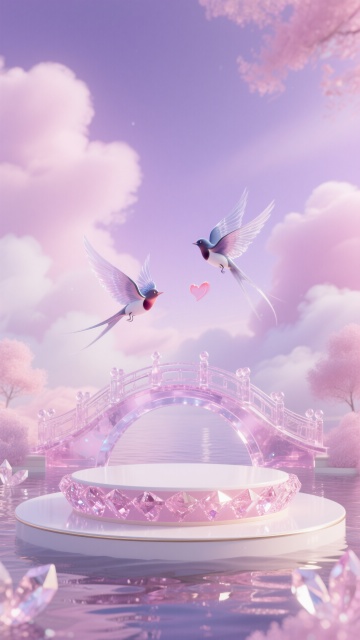 这是一个数码渲染的场景,在水面上有一座程式化的浅粉色中国式拱桥。一个六角形的平台,也是浅粉色和柔和的,坐落在水中,作为一个舞台或展示区域。粉红色的荷花和云彩散落在整个场景中,营造出一种柔和浪漫的氛围。水有一个光滑的,反射表面与微妙的波浪,整体调色板柔和和谐。光似乎是从上面来的,用柔和的漫射光照亮了这个场景。桥和平台有一种微妙的,几乎是空灵的品质。这种风格在视觉上很吸引人,让人联想到浪漫的中国传统环境。场景是对称的,平台位于桥的中央。柔和的云和水的效果增加了空灵的质量。该图像是为广告或艺术表现而设计的。后面有两只小喜鹊飞在鹊桥上面。