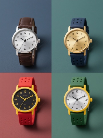 6个不同样式、不同配色、不同类型的钟表,包括圆形、方形、复古、现代等款式,表盘设计各异,配色丰富多样,整齐排列在纯色背景上,每个钟表细节清晰,指针和刻度完整,整体构图平衡对称,具有简洁的设计感和良好的视觉层次。
