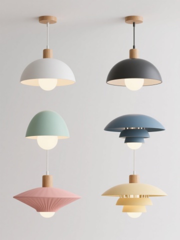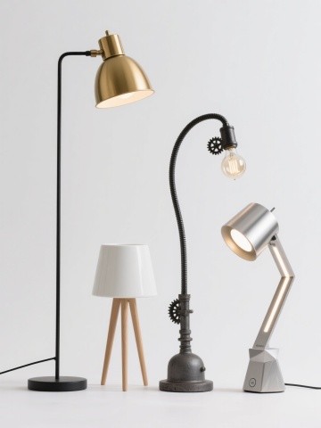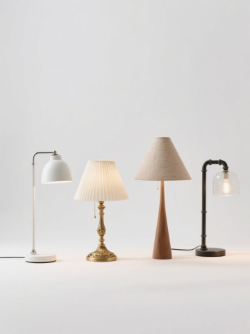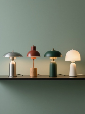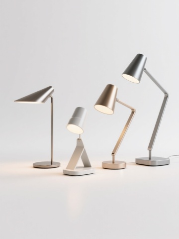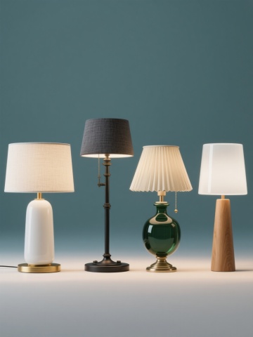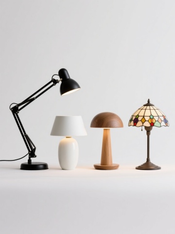 4个不同样式、不同配色、不同风格的卡通风格台灯,每个台灯都具有圆润的造型、光滑的塑料质感和明亮的灯光效果,它们整齐地排列在纯色背景上,整体画面呈现出简洁、可爱、充满童趣的氛围,色彩鲜艳明快,光影过渡柔和自然,每个台灯的设计细节丰富,包括不同形状的灯罩、灯杆和底座,以及独特的颜色搭配。