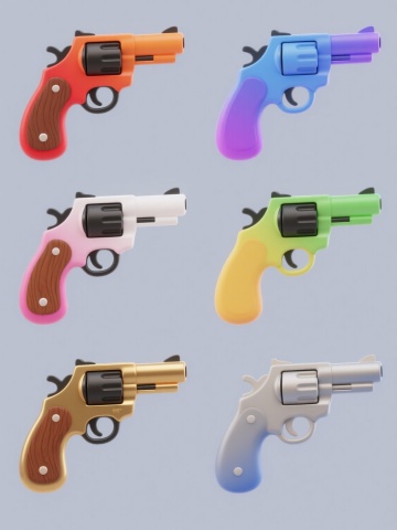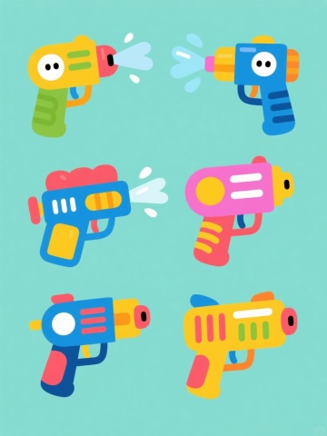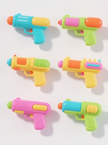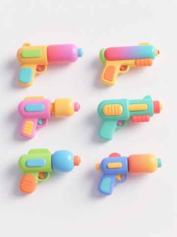 6个不同样式、不同配色、不同风格的卡通风格水枪,每个水枪拥有圆润可爱的造型、鲜明饱和的纯色搭配、光滑无纹理的表面质感和简洁的几何形态,以整齐的阵列方式排列在纯白色的纯色背景上,整体呈现出3D渲染的视觉效果,具有柔和的阴影和清晰的边缘轮廓,充满童趣和活泼感。