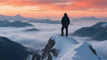 一位穿着深色户外服装的登山者背对着镜头站在覆盖着皑皑白雪的陡峭山峰之巅,俯瞰着脚下云海翻腾的壮丽山脉全景,天空呈现出温暖的橙红色调,云彩被染上柔和的霞光,整体画面采用超写实主义风格,光影效果细腻,云海与山峦的层次感分明,营造出宁静而壮阔的氛围,色调从原图的蓝白色系转变为温暖的橙红色系,保持原有的构图和细节质感。