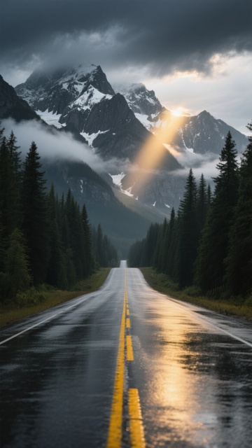 一条湿滑的沥青公路,路面泛着水光,中央是两条醒目的黄色双实线,道路笔直地延伸向远方,消失在群山的怀抱中。公路两侧是茂密的墨绿色松树林,挺拔的树木整齐排列。远处是巍峨壮丽的雪山,山顶覆盖着皑皑白雪,山体呈现出岩石的灰黑色纹理,云雾在山间缭绕,天空中乌云密布,一缕金色的阳光从云层的缝隙中洒落,照亮了部分山顶,营造出一种神秘而壮丽的氛围。