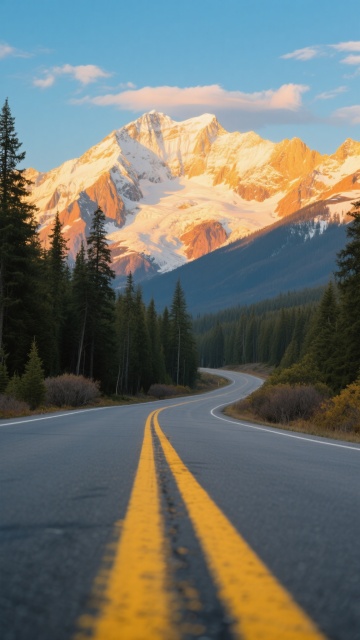 一条蜿蜒的沥青公路,路面上画着两条醒目的黄色分隔线,公路两旁是茂密的森林,有高大的松树和一些低矮的灌木。远处是雄伟的雪山,山顶覆盖着皑皑白雪,在阳光的照射下,雪山呈现出金黄色和橙色的光辉。天空湛蓝,飘着几朵淡淡的云彩,营造出一种宁静而壮丽的自然景观氛围。