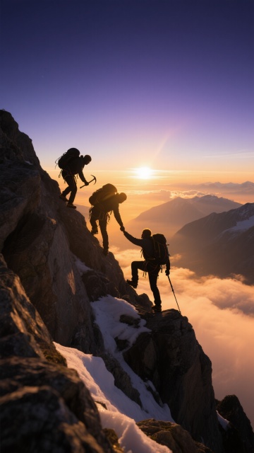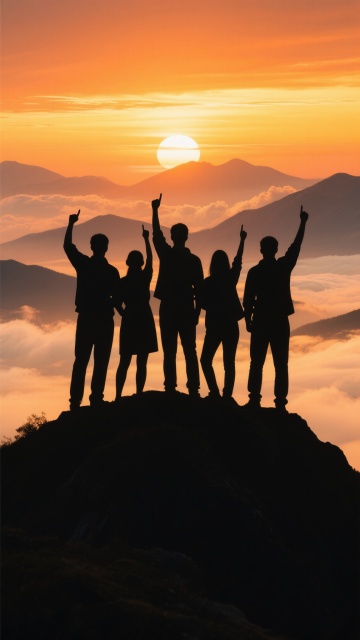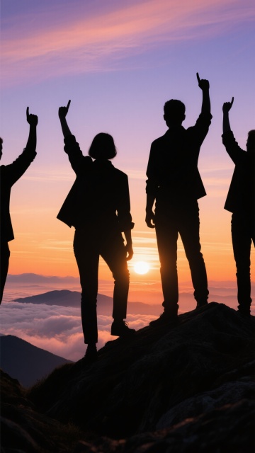 一群团队成员的黑色剪影站在山顶上,他们高举双手做出胜利手势,背景是壮丽的日出或日落景象,天空呈现出从橙色到紫色的渐变色彩,远处的云海和山脉轮廓清晰可见,整体画面充满了成就感和团队凝聚力,剪影边缘锐利分明,光线柔和地洒在人物轮廓上,营造出温暖而励志的氛围。