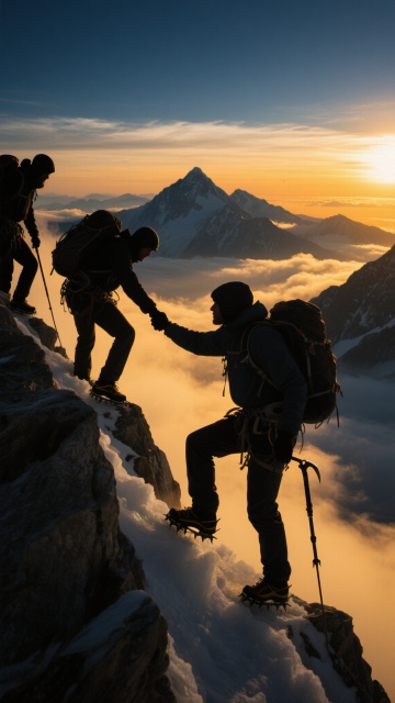 团队成员的黑色剪影站在山顶,他们高举手臂做出胜利手势,背景是壮丽的日落景象,天空呈现出从橙色到黄色的渐变色彩,远处的云层被染成温暖的色调,山峰在夕阳下形成层层叠叠的剪影效果,整体画面充满了成就感和团队合作的氛围。