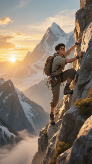 写实风格登山场景,一位身着专业登山装备的女性正奋力攀登陡峭的橙红色岩壁,她身体前倾,双手紧握岩点,右腿向上迈出,腰间安全绳与装备包清晰可见,背后是壮丽的日落景象,天空从深蓝渐变为橙黄,远处层峦叠嶂的山脉在夕阳下泛着金色光芒,阳光从人物侧后方照射,在岩壁上形成强烈的明暗对比和温暖的光晕,整体画面充满动感与力量感,展现出登山运动的挑战与自然的壮美。