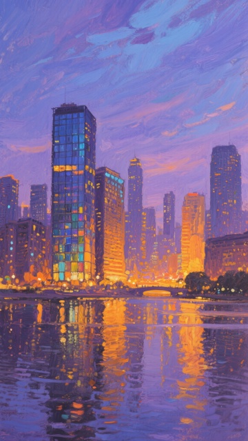 印象派风格城市夜景,莫奈式笔触,朦胧光影效果,紫蓝色渐变天空,橙黄色城市灯光,高楼建筑群剪影,水面倒影效果,温暖色调氛围,柔和边缘处理,艺术化城市景观,印象派标志性的色彩点染技法,光线在建筑玻璃幕墙上的斑斓折射,远处天空与城市灯光交融的朦胧美感,整体画面呈现出如梦似幻的光影流动感。