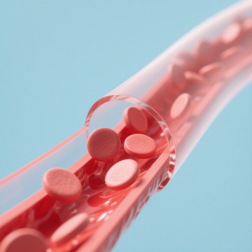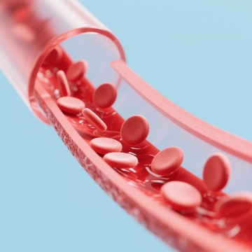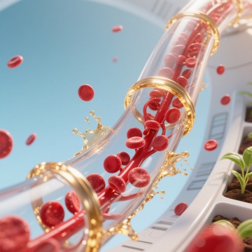 在清新干净的白蓝渐变背景上,类似血管结构的透明管状通道内壁布满细腻纹理,通道内流动着饱满的、富有光泽的红色养分颗粒,如同红细胞般圆润光滑,通道边缘有金色的光辉勾勒并伴有金色的液体飞溅效果,养分颗粒在通道内外自然散落,整体画面呈现出科技感与生命力的融合,光影对比强烈,高光处闪耀着金属般的光泽,营造出农业生长过程中养分高效输送的精密与活力氛围。