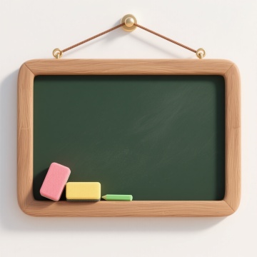 软3D风格,一块挂在白色背景上的木质边框黑板,木质边框呈现自然的浅棕色木纹,带有细小的纹理细节,质感柔和不生硬,黑板主体为深绿色,表面平滑,边缘与木质边框衔接自然,顶部通过两条棕色的细链条悬挂,链条两端连接在边框顶部的金属挂钩上,金属挂钩为浅金色,带有轻微的光泽感,黑板下方的左下角放置着两块彩色的黑板擦,一块是粉红色的,另一块是黄色的,旁边还有一支绿色的粉笔,整体画面色彩和谐,光影柔和,呈现出轻松、简洁的氛围,物体边缘圆润,立体感通过柔和的阴影和微妙的渐变来表现,没有强烈的明暗对比,整体风格统一、柔和、清新。