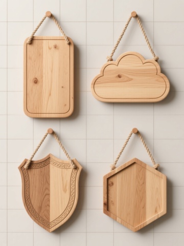 六个不同样式、不同材质、不同风格的指示牌,白色背景,排列整齐,无文字,卡通风格,扁平化设计,简洁线条,明快色彩,木质纹理,金属质感,塑料光泽,复古造型,现代简约,悬挂式设计,手绘感,平滑边缘,圆角处理,阴影效果,视觉平衡,统一布局,细节丰富,材质对比鲜明,无logo,无电话地址,无二维码
