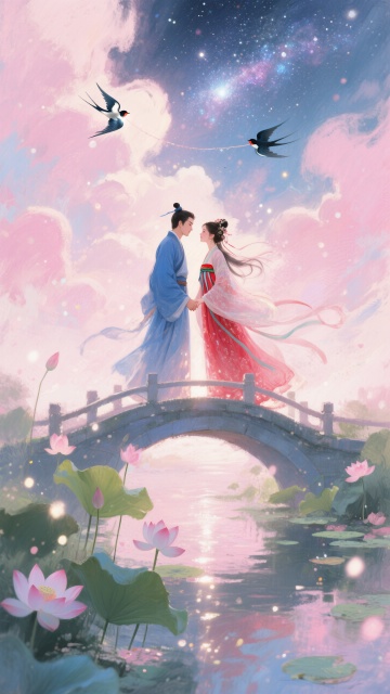 满童话色彩与文化底蕴七夕传说,唯美的画面,围绕牛郎织女鹊桥相会的经典场景