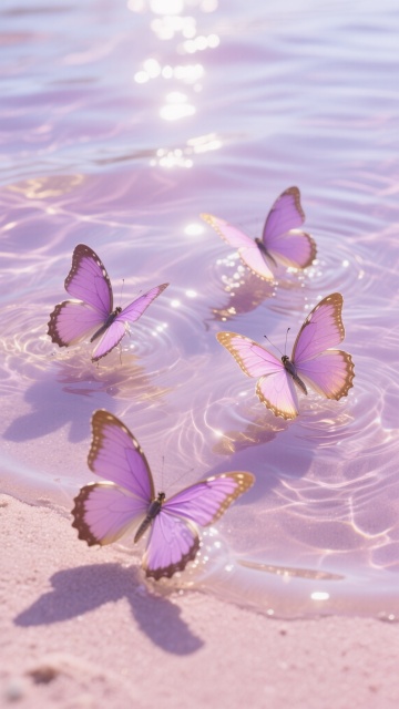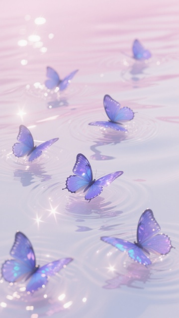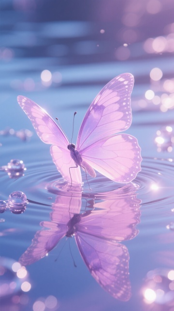 一只透明质感的蝴蝶停留在水面上,翅膀呈现出梦幻的粉紫色渐变,水面倒映着蝴蝶的身影,周围点缀着晶莹的水珠和光斑,整体画面充满了浪漫唯美的氛围,光影效果柔和,色调以粉紫色为主,带有一丝清冷的蓝色调,营造出一种神秘而优雅的感觉。