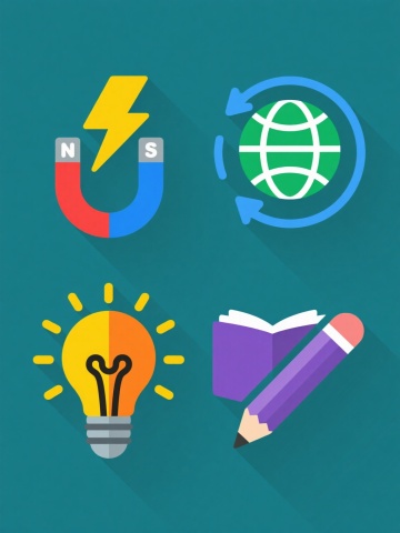 一套4个元素的系列素材集合,每个元素均采用低多边形3D立体风格,具有圆润边缘和柔和高光,纯色背景,规整网格排布。第一个元素:蓝色和粉色相间的马蹄形磁铁,两端有白色方块,上方有黄色闪电符号;第二个元素:绿色和橙色相间的电池,顶部有黑色电极,周围环绕蓝色电流线条;第三个元素:紫色和黄色相间的灯泡,内部有白色灯丝,底部有银色金属螺口,顶部有红色光芒;第四个元素:红色和蓝色相间的齿轮,中心有银色轴,边缘有橙色小齿,周围有灰色机械零件。每个元素色彩鲜明,对比度高,保持统一的3D立体感和简约设计风格。