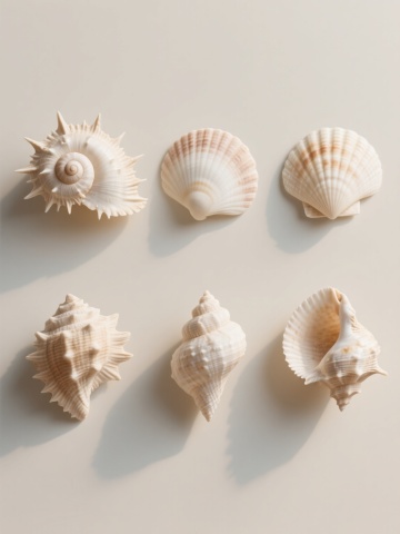 一系列四个不同海鲜贝类插画,每个贝类具有独特形态,保持统一的手绘水彩风格,细腻的线条勾勒,柔和的渐变色彩,每个贝类置于纯色背景上,整体画面色彩变换为蓝绿色调,四个元素规整排布,形成和谐的系列素材集合,无文字信息。
