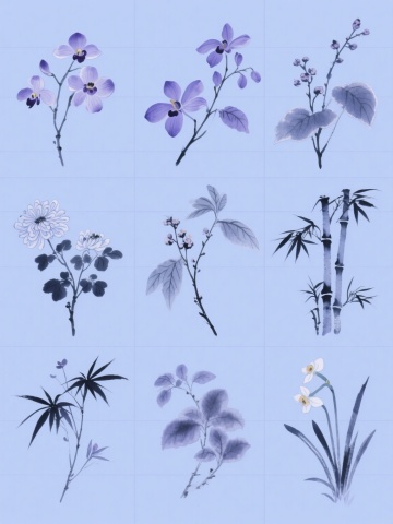 中国传统水墨画风格,以淡蓝色为纯色背景,画面整体色彩变换为清新淡雅的蓝紫色调,保持原作风韵的植物元素,精心绘制同风格的不同植物(包括兰花、菊花、梅花、竹子、水仙)元素素材集合,每株植物均以细腻的水墨笔触勾勒形态,花瓣与叶片边缘晕染柔和,叶脉纹理清晰可见,茎秆纤细挺拔,带有自然的墨色浓淡变化,所有植物元素呈网格状规整排布,彼此间距均匀,构图平衡对称,营造出宁静雅致、和谐统一的视觉效果,保持水墨画特有的透明晕染质感和留白意境,整体画面简洁大方,具有浓厚的东方艺术韵味。