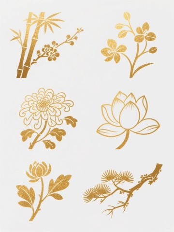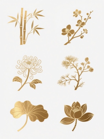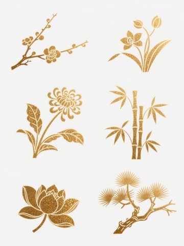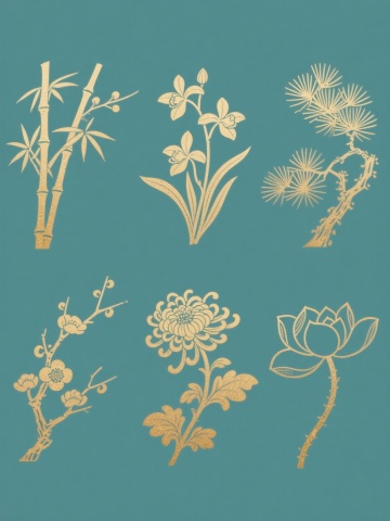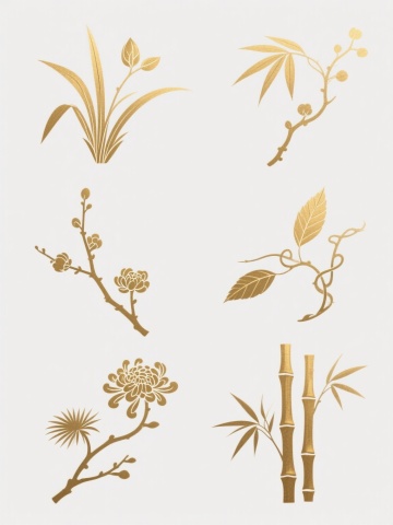 古香古色的工笔淡彩风格植物素材集合,纯色背景,画面整体变换为统一协调的新色调,保持原作风雅的笔触质感、柔和的光影过渡与清雅的色彩和谐度。集合包含四种完全不同种类的植物:傲然绽放的红梅(枝干苍劲,花瓣层层叠叠,花蕊金黄点缀)、幽香雅致的幽兰(叶片修长舒展,花茎挺拔,淡雅花朵姿态各异)、挺拔苍翠的翠竹(竹竿挺拔有节,竹叶疏密有致,生机盎然)、凌霜盛开的秋菊(花瓣卷曲富有层次感,花型饱满,尽显高洁)。四种植物元素内容完整保留工笔画的细腻细节,以规整排布的方式组合在一起,形成一幅兼具艺术性与装饰性的古风水墨植物图鉴。