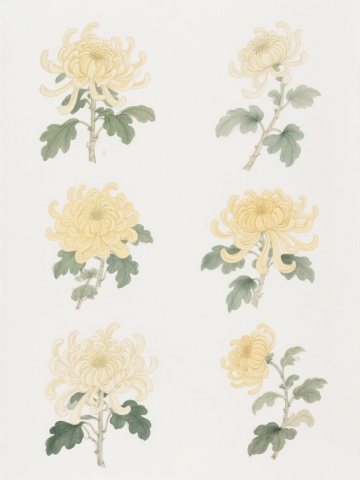 6个不同样式、不同材质的菊花,白色背景,排列整齐,中国传统工笔画风格,细腻的线条勾勒,柔和淡雅的黄色系花瓣,绿色的叶片,花朵形态饱满,层次分明,具有透明感的水彩晕染效果,整体构图简洁大方,画面清新雅致,细节丰富,色彩和谐统一
