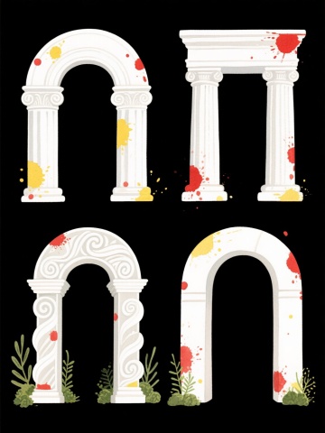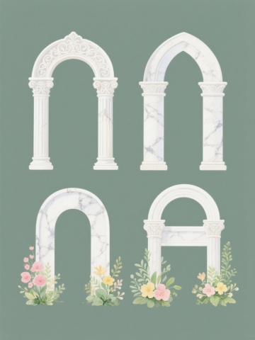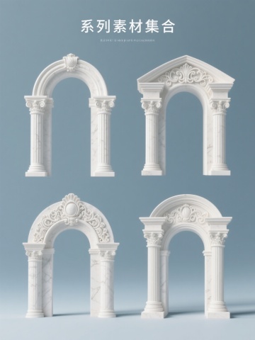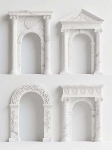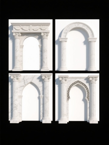 4个完全不同造型的古典风格拱门元素集合,每个拱门均保持白色纯色背景、3D渲染质感、光滑细腻的白色大理石材质、清晰的光影过渡和精致的浮雕细节,拱门造型分别为:1.科林斯柱式带复杂叶形柱头的圆形拱门,2.尖顶哥特式带玫瑰窗镂空纹样的尖拱,3.罗马式厚重多拱券连拱,4.东方古典带龙纹浮雕的半圆形拱门,所有拱门元素规整排布成系列素材,无文字、二维码及多余装饰。
