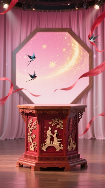 一座以古典木质结构为主的八角形展台,台身雕刻着精美的喜鹊登枝与牛郎织女鹊桥相会的图案,木质纹理清晰可见,表面涂着一层带有光泽的朱红色漆,在灯光下闪耀。背景是一幅巨大的渐变幕布,从底部的深粉色向上渐变为浅粉色,幕布上隐隐约约浮现着金色的星云图案与飞舞的红色丝带,丝带随风飘动,仿佛要从幕布中跃出。在背景的上方,悬浮着几个由淡金色光芒勾勒出的心形,心形内部闪烁着粉色的星光。