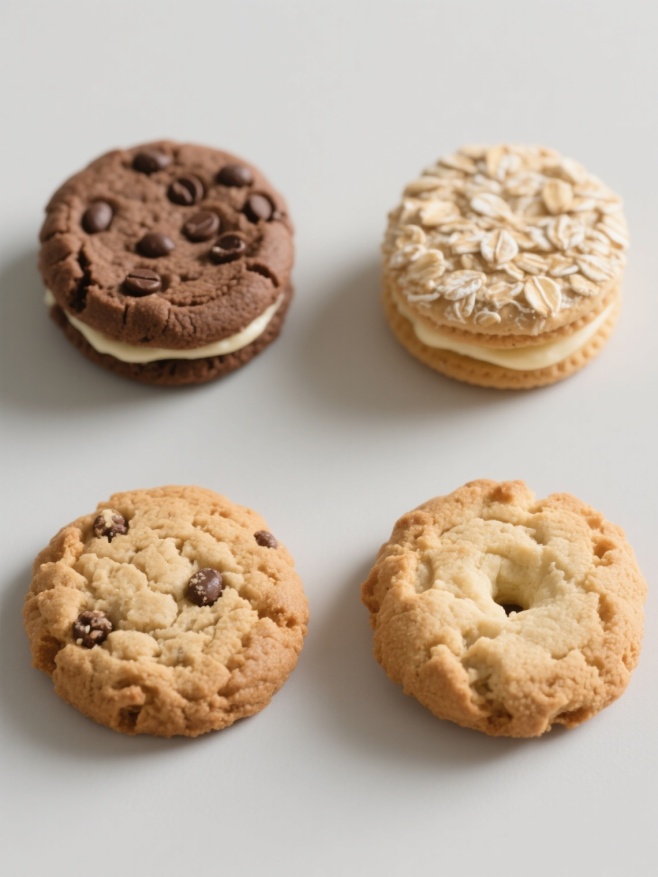 简约现代风格食品摄影,四个不同种类的饼干(包含巧克力豆饼干、奶油夹心饼干、燕麦饼干、曲奇饼干)规整排布成2x2矩阵,饼干表面纹理清晰可见,具有真实的烘焙质感和自然光影,统一采用纯色背景,无文字、无logo、无水印,整体构图简洁干净,突出饼干的形态和细节,色调柔和自然。