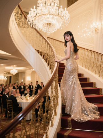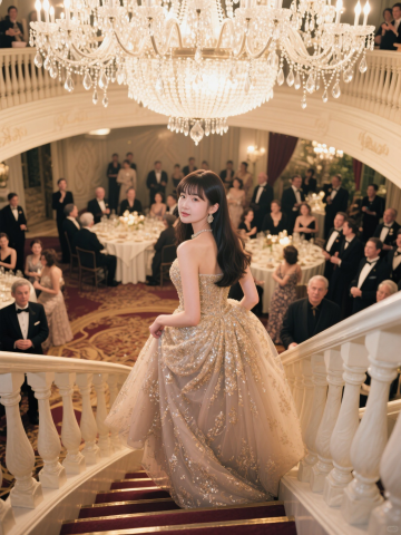 写真摄影,海贼王娜美Cosplay形象鲜明。她有着乌黑的长发,自然垂落,发丝柔顺有光泽。身着粉色的短袖衬衫,领口是俏皮的翻领设计,袖口有可爱的褶皱,搭配一条深色的短裙,肩上背着黑色的双肩包,胸前系着一条黑写真摄影,豪门千金,华丽礼服,女生在宴会厅从旋转楼梯走下去,水晶灯绚丽夺目,楼下是客人们,女生有刘海,长发