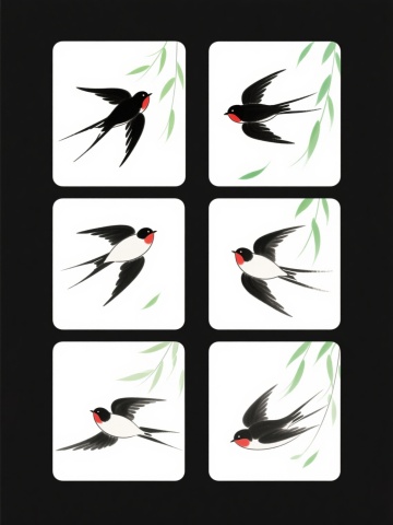 中国水墨画风格,简约现代设计,纯色背景,六个春季元素规整排布,包含展翅飞翔的燕子(红胸、灰黑翅膀与长尾、白色腹部、黑色喙爪)、盛开的桃花、嫩绿柳叶、春雨水滴、发芽的种子、蝴蝶,每个元素均采用水墨晕染笔触,色彩淡雅和谐,无文字、无logo、无水印,整体造型简洁明快,富有春日气息。