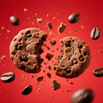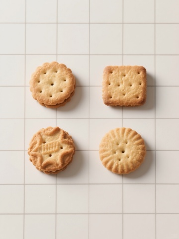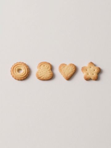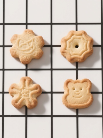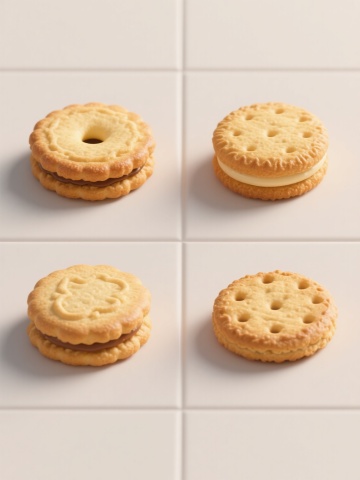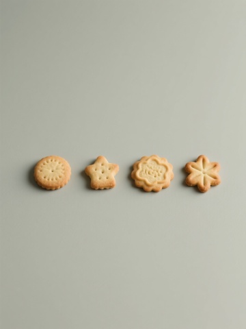 简约现代风格,纯色背景,四个不同造型的饼干规整排布,饼干表面呈现自然的烘焙色泽,带有巧克力豆或其他配料的纹理细节,整体造型简洁,无任何文字、logo和水印,光影柔和,突出饼干的质感和立体感。