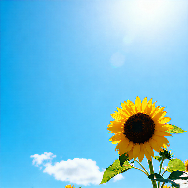 一片生机盎然的向日葵花田,前景中几朵盛开的向日葵占据主要视觉位置,金黄色的花瓣层层叠叠,中心是深棕色的花盘,布满细密的葵花籽,花茎挺拔,翠绿的叶片舒展,边缘带有自然的锯齿。向日葵们迎着阳光,花盘微微上扬。背景是晴朗的蓝天,漂浮着几朵蓬松的白云,阳光明媚,光线充足,在花瓣和叶片上形成明亮的高光和清晰的阴影,整体画面色彩鲜艳明快,充满夏日的活力与温暖。详情