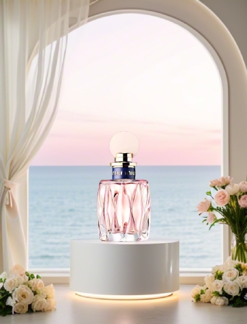 鎏金风香水瓶悬浮于水波之上,搭配流动光影与金玫瑰,3D重拟物质感融合液态金属光泽,营造奢华梦幻的浪漫氛围。