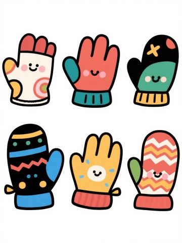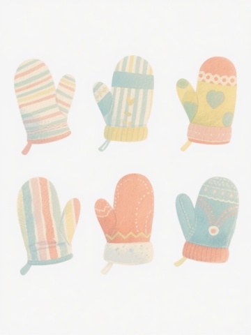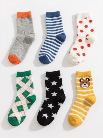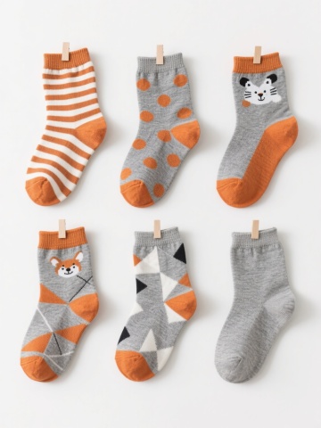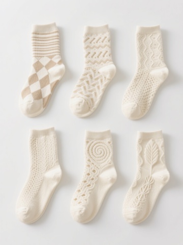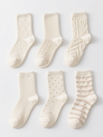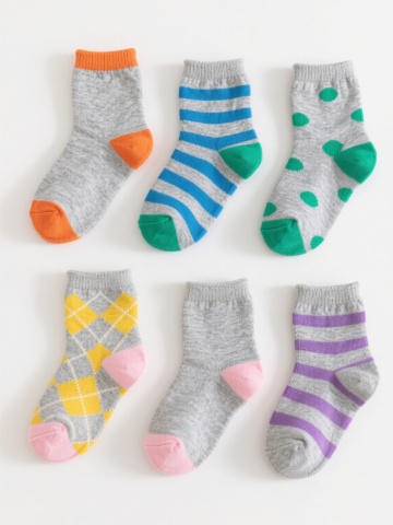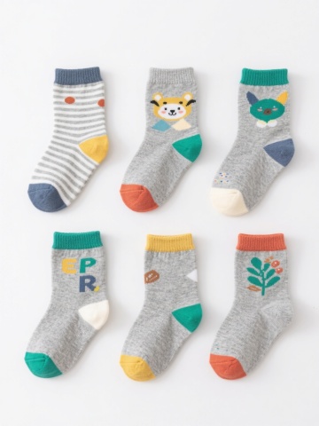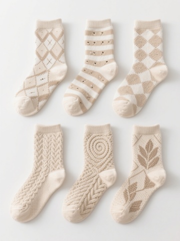 一组六款不同设计的儿童袜子插画,采用简约手绘风格,柔和的马卡龙色系配色,每款袜子都有独特的卡通图案装饰(如小动物、几何图形、蔬菜水果、星星月亮、字母数字、条纹波点),圆形袜口有细致的罗纹纹理,袜身呈现柔软的针织质感,线条圆润流畅,整体保持统一的稚拙可爱画风,所有袜子整齐排列在纯色背景上,形成协调的系列感。