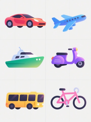 6个交通工具图标以2行3列的规整网格排布在纯色背景上,均采用与示例电动车一致的3D低多边形卡通风格,造型简约圆润,边缘光滑无棱角,色彩明快饱和,每个交通工具都有鲜明的主色调和简洁的黑色细节(如轮胎、座椅),光影柔和带有轻微体积感,包含电动车、汽车、自行车、飞机、火车、轮船,无任何文字、logo或水印。