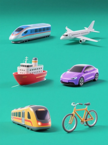 一套6个完全不同元素内容的旅游主题3D立体插画系列素材集合,每个元素均采用圆润可爱的卡通造型风格,明亮饱和的纯色配色方案,细腻的黏土质感表现,柔和均匀的漫反射光影效果,规整的构图布局,无任何文字、logo和水印。第一个元素:黄色卡通巴士停在绿色草坪上,车顶有橙色行李箱,旁边有蓝色自行车、橙色手提箱、粉色信封和蓝色飞机;第二个元素:红色卡通火车行驶在蓝色轨道上,车厢载有棕色登山包、黄色帐篷和绿色树木,旁边有白色指南针和紫色登山杖;第三个元素:蓝色卡通轮船漂浮在浅蓝色海面上,船上有黄色救生圈、橙色望远镜和绿色渔网,旁边有粉色海星和白色贝壳;第四个元素:绿色卡通热气球飞翔在橙色天空中,气球上有红色条纹,吊篮里有棕色野餐篮、黄色三明治和粉色饮料,旁边有白色云朵和蓝色小鸟;第五个元素:紫色卡通越野车行驶在棕色沙漠上,车顶有绿色行李架,旁边有黄色仙人掌、红色油桶和蓝色地图,地上有白色车辙印;第六个元素:橙色卡通自行车停在紫色花田中,车上有蓝色水壶、绿色背包和粉色花朵,旁边有黄色蝴蝶、白色蒲公英和棕色长椅。所有元素均以纯色为背景,整体色彩协调统一,保持相同的3D立体风格和旅游元素类目,呈规整排布。