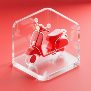 现代感十足的软3D风设计,红色电瓶车置于透明立方体中,简洁时尚。