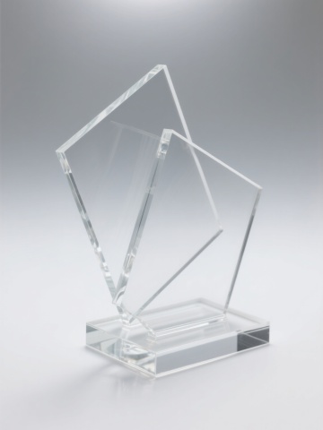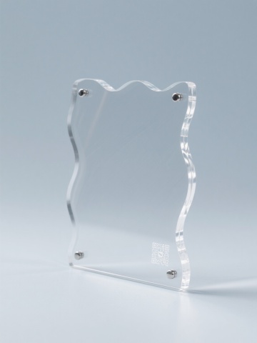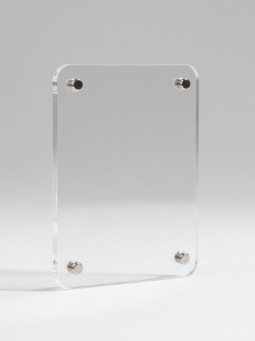 一块透明亚克力材质的长方形标牌,表面光滑通透,四角各有一个圆形银色金属螺丝固定,螺丝带有轻微的金属光泽和阴影,整体呈现简约现代的设计感,背景为纯白色纯色背景,标牌边缘有精致的圆角处理,光线从斜上方照射,在亚克力表面形成柔和的高光和细微的反光效果,标牌下方投射出淡淡的、模糊的矩形阴影。