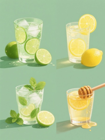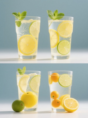 四宫格规整排布的高写实饮品摄影,每张图均为纯色背景,保持通透玻璃器皿、立方体冰块、切片水果装饰、新鲜草本点缀的元素类目,第一张为深琥珀色冰红茶配柠檬片与薄荷叶,第二张为亮粉色草莓气泡水配新鲜草莓与迷迭香,第三张为青绿色莫吉托鸡尾酒配青柠角与碎冰,第四张为乳白色椰奶西米露配芒果块与薄荷叶,统一采用高清晰度、柔和侧光、清晰水珠纹理、通透液体质感、锐利对焦的商业摄影风格,背景分别为浅灰、浅粉、浅绿、浅黄的纯色渐变,整体保持一致的光影逻辑与构图比例。