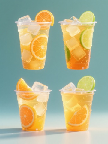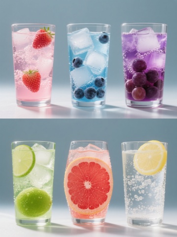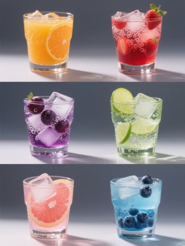 一组四张规整排布的饮品系列素材集合,每张均为高清晰摄影风格,纯色背景,保持相同的玻璃杯形态和杯口设计。第一张:透明玻璃杯中装满橙色的冰爽橙汁,内含数片新鲜橙子切片和大量方形冰块,液体表面有细密气泡,杯口装饰一片完整的橙子片;第二张:透明玻璃杯中盛有粉红色的草莓苏打水,漂浮着几颗对半切开的新鲜草莓和冰块,液体呈现诱人的粉紫色渐变,杯口点缀一颗完整草莓;第三张:透明玻璃杯中是金黄色的菠萝汁,加入了三角形菠萝块和冰块,液体清澈透亮,杯口斜插一片带绿色叶子的菠萝片;第四张:透明玻璃杯中为蓝色的蓝莓气泡水,内含蓝莓果肉和冰块,液体呈现渐变的蓝紫色,杯口装饰几颗蓝莓。所有饮品均保持相同的光影效果,杯壁有细微的水珠,整体风格统一,色彩鲜明,突出饮品的清爽感和新鲜感,无任何文字、LOGO、二维码及地址信息。