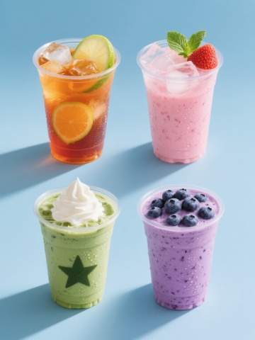 白色背景上,6个完全不同造型的同系列透明塑料杯饮品素材集合规整排布,保持超写实摄影风格,光影明亮通透,杯身和液体有清晰的高光和阴影细节,冰块棱角分明且有透明质感,每个杯子中分别装有不同色彩和元素的饮品:1. 粉红色草莓冰饮,杯口装饰草莓片和薄荷叶,杯壁贴有对半切开的草莓;2. 青绿色猕猴桃冰沙,顶部有猕猴桃果肉块和奇异果切片,杯侧插着小绿叶;3. 紫色葡萄苏打水,杯中漂浮着整颗葡萄和葡萄切片,杯口放有葡萄串装饰;4. 橙色芒果冰茶,杯内有大块芒果果肉和芒果片,杯口斜插芒果角;5. 淡蓝色蓝莓气泡水,杯底沉着蓝莓,杯口装饰蓝莓和迷迭香;6. 浅绿色青柠莫吉托,含青柠片和薄荷叶,杯口插青柠角,液体清澈有气泡,整体构图平衡,每个饮品造型独特,色彩鲜明,细节丰富,适合作为系列饮品宣传素材。
